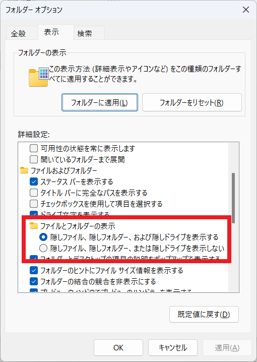「隠しファイル、隠しフォルダー、および隠しドライブを表示する」